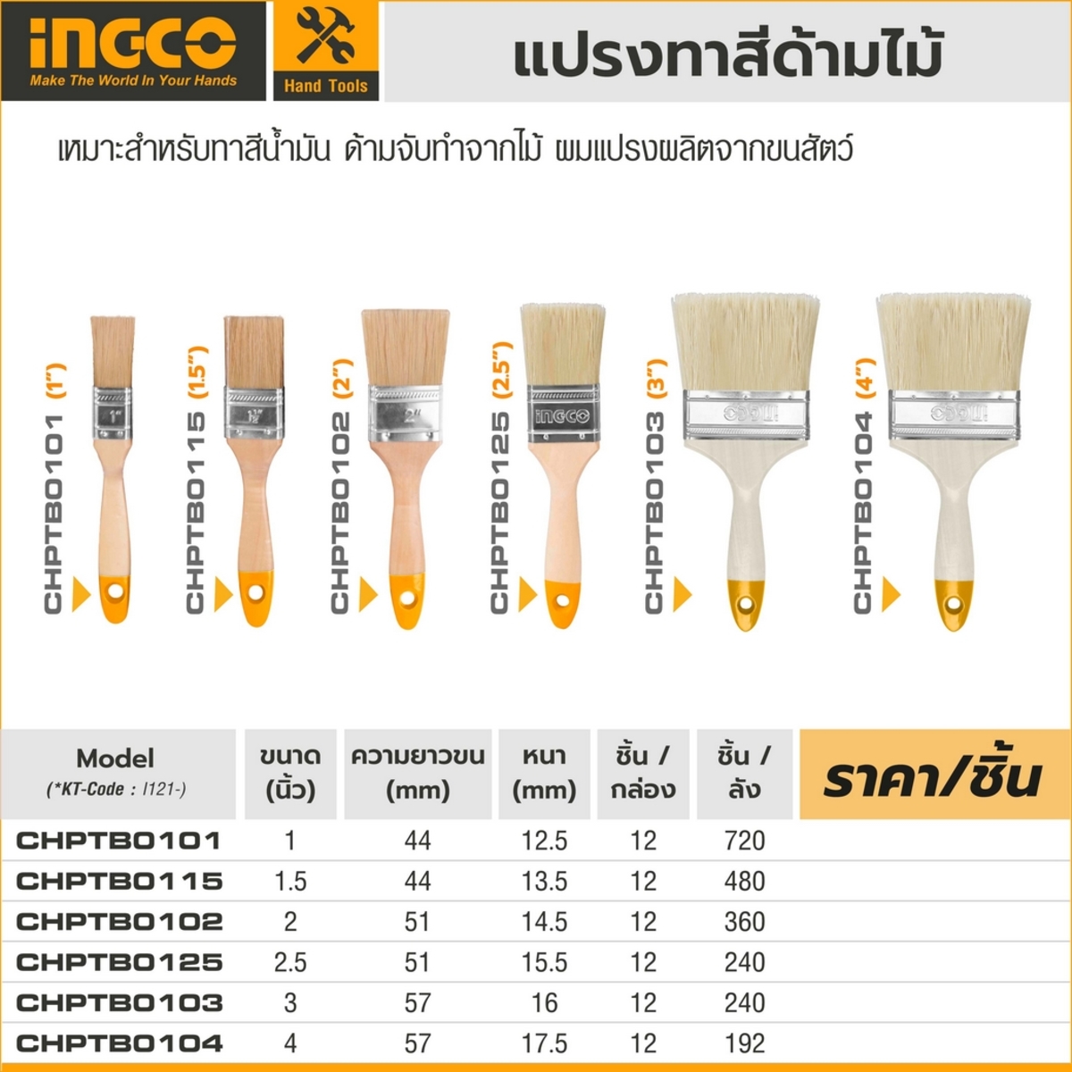 แปรงทาสีด้ามไม้ อิงโก้ (INGCO) รุ่น CHPTB0125 ขนาด 2.5 นิ้ว ขนแปรงยาว 51 มม. เหมาะสำหรับทาสีน้ำมัน