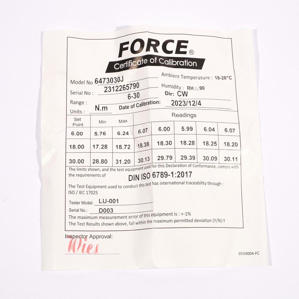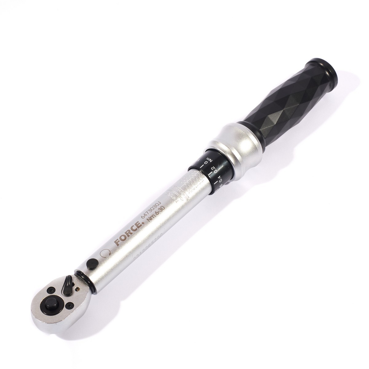 FORCE ประแจปอนด์ชนิดมีเสียง ขนาด 3/8 นิ้ว ยาว 1010 มม. รุ่น 6473030J แรงบิด 6-30 นิวตันเมตร ด้ามดำ มีใบรับรองการตั้งค่ามาในชุด