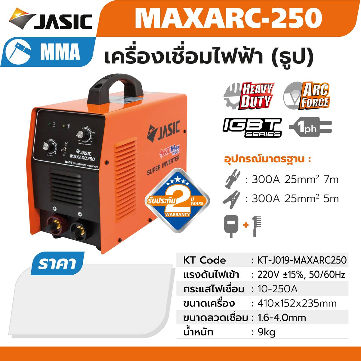 JASIC เครื่องเชื่อมอินเวิร์ทเตอร์ MMA รุ่น MAXARC250 กระแสไฟเชื่อม 10-250 แอมป์ แรงดันไฟ 220 โวลต์ ข