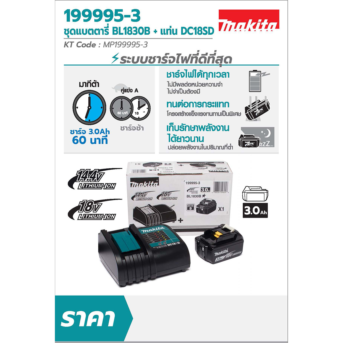 ชุดแบตเตอรี่ MAKITA 18 โวลต์ ความจุ 3.0Ah 1 ก้อน พร้อมแท่นชาร์จมาตรฐาน