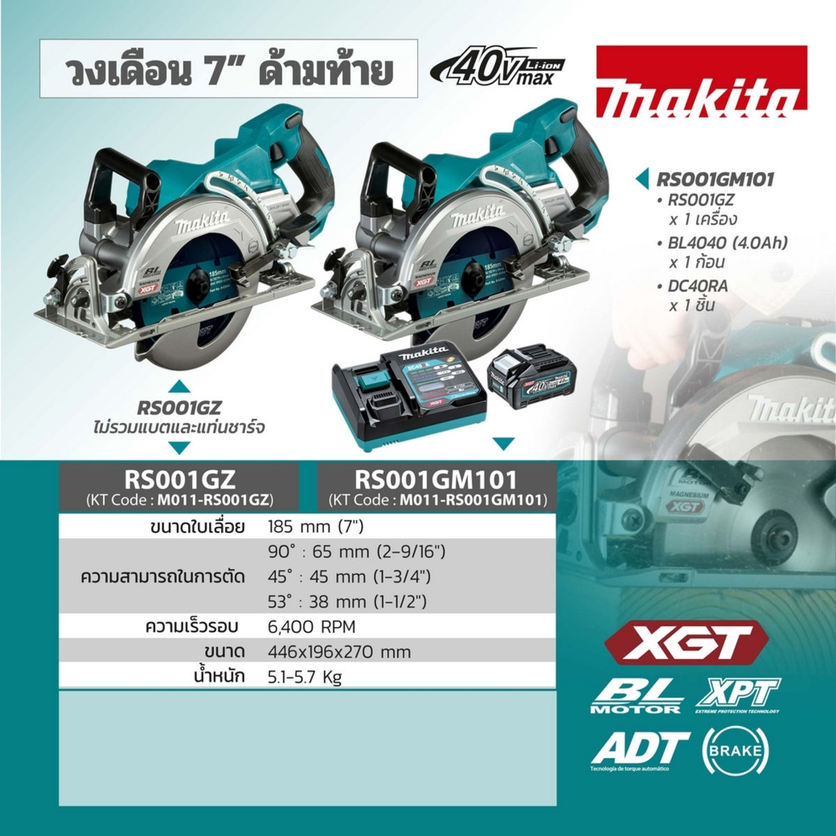 MAKITA รุ่น RS001GM101 เลื่อยวงเดือน 40 โวลต์ ขนาด 7 นิ้ว ความเร็วรอบ6,400 รอบ/นาที รวมแบตเตอรี่-แท