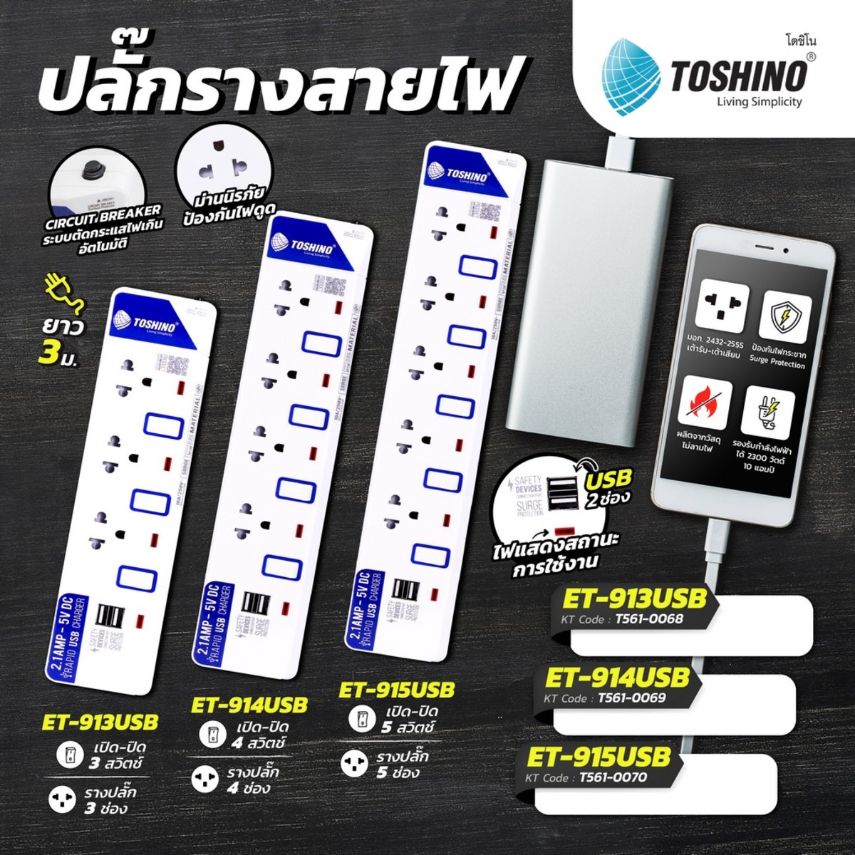 TOSHINO ปลั๊กพ่วง 3 ช่อง 2 USB 3 สวิตช์ สายไฟ 3 เมตร 10 แอมป์ รุ่น ET-913USB สาย VCT 3X0.75 S.qm มาต